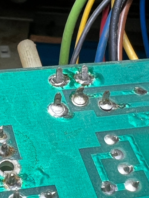 שחררתי את הברגים ומשכתי בעדינות את הלוח החוצה ככל שיכולתי, מכיוון שלא הצלחתי לנתק אותו בקלות מה-CRT עצמו ולא רציתי להפעיל יותר מדי כח. בנוסף לקבל התלוש, מייד ראיתי שיש גם בעייה של Cold solder joints - עם הזמן, או בעקבות זעזוע מכני, הבדיל שמשמש להלחמה מפתח סדקים ובשלב מסויים כבר לא יוצר מגע רציף: