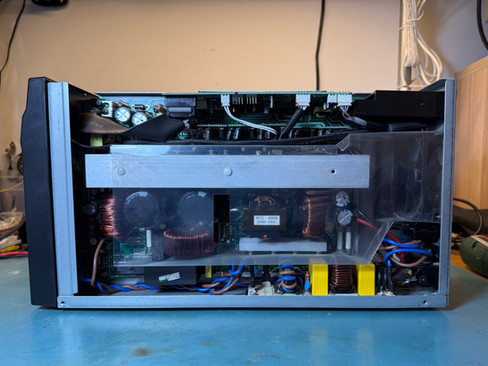 למעלה מימין בתמונה נמצא הפאנל האחורי. ממנו אפשר לקחת מחברי IEC לחשמל רשת ובתי פיוז. למטה בתמונה נמצאים חלקים שאין לי שימוש בהם ולמעלה משמאל נמצא החלק הכי מעניין - הלוח הראשי: